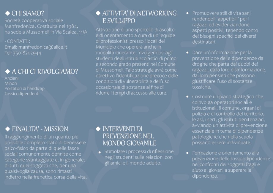 La Società Cooperativa Sociale Manfredonica, fondata nel 1984, opera nel territorio di Mussomeli (CL) con l’obiettivo di promuovere il benessere delle persone e combattere le disuguaglianze sociali.